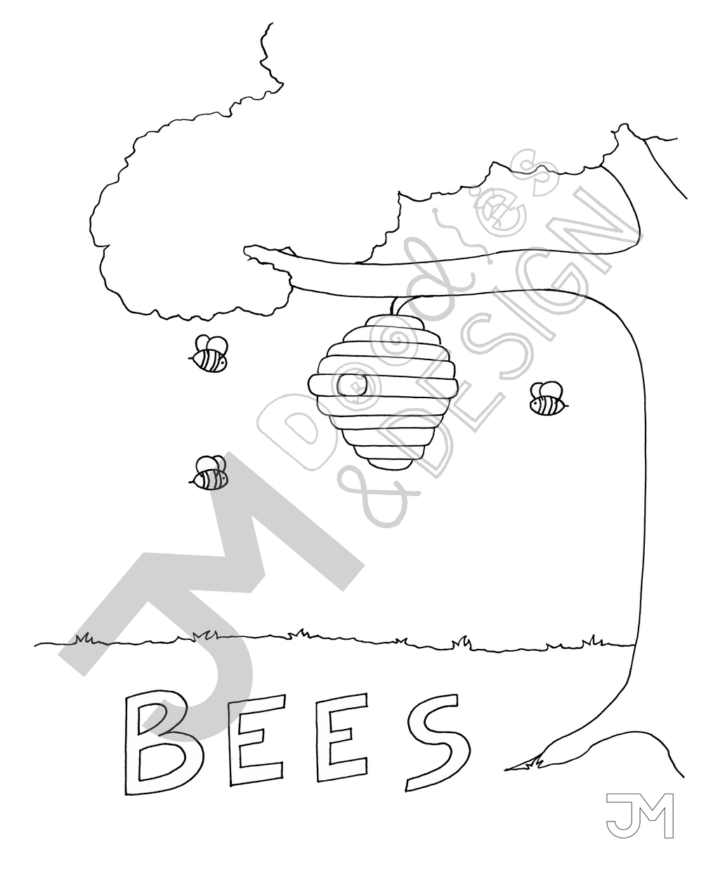 Enjoy coloring this coloring page of bees and their hive. Originally drawn for a library story time, this page is geared towards children but can be enjoyed by anyone who likes to color.